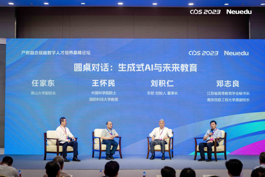 本次高峰论坛中,特别设置了以“生成式AI与未来教育”为主题的圆桌对话,王怀民院士,刘积仁教授,江苏省高等教育学会秘书长、南京信息工程大学原副校长邓志良教授,燕山大学副校长任家东教授四位嘉宾围绕“面对ChatGPT引发的重大挑战,如何处理高等教育的变与不变、公平和效率”“ChatGPT热潮下高等教育领域的学科专业设置将面临哪些调整和变化”“ChatGPT等生成式AI给教育教学内容和方式带来的机遇与挑战”“伴随着生成式AI的深度参与,对学生的哪些能力的培养更为重要”等议题发表真知灼见。