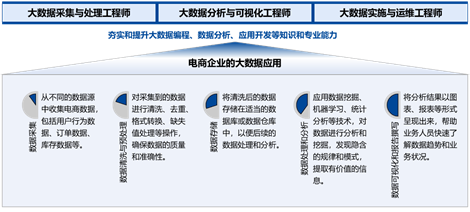 学生可以在电商大数据实训室中体验、学习和实践电商大数据统计分析平台全栈技术,掌握大数据采集与处理工程师、大数据分析与可视化工程师、大数据实施与运维工程师所需具备的核心专业技术,对如何利用大数据技术对电商业务运营和开展做出更加准确、科学的预测和决策有初步的体验,有助于学生对商产融合和产业数字化转型有更好的认识和理解。