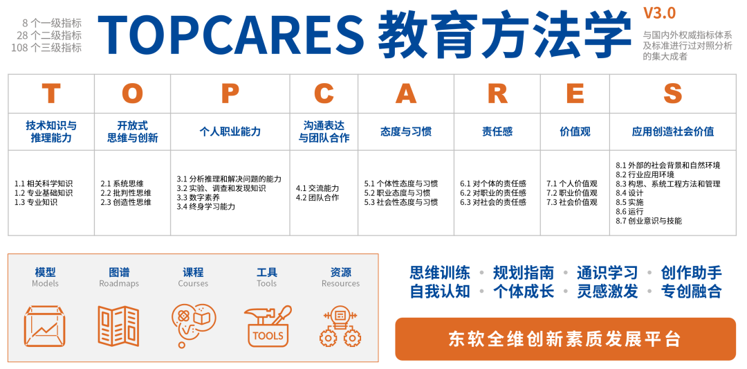在此背景下,美狮贵宾会教育面向院校推出针对学生软素质培养提升的一站式解决方案——美狮贵宾会全维创新素质开展平台。该平台以TOPCARES教育方法学为指引,针对学生八大领域能力的培养目标,给予了模型、图谱、课程、工具、资源等内容,辅以完整的平台管理功能,从根本上解决了少资源、缺体系、无支撑的三大难题,为学校和专业人才的素质教育及创新能力培养给予了完善的支持。