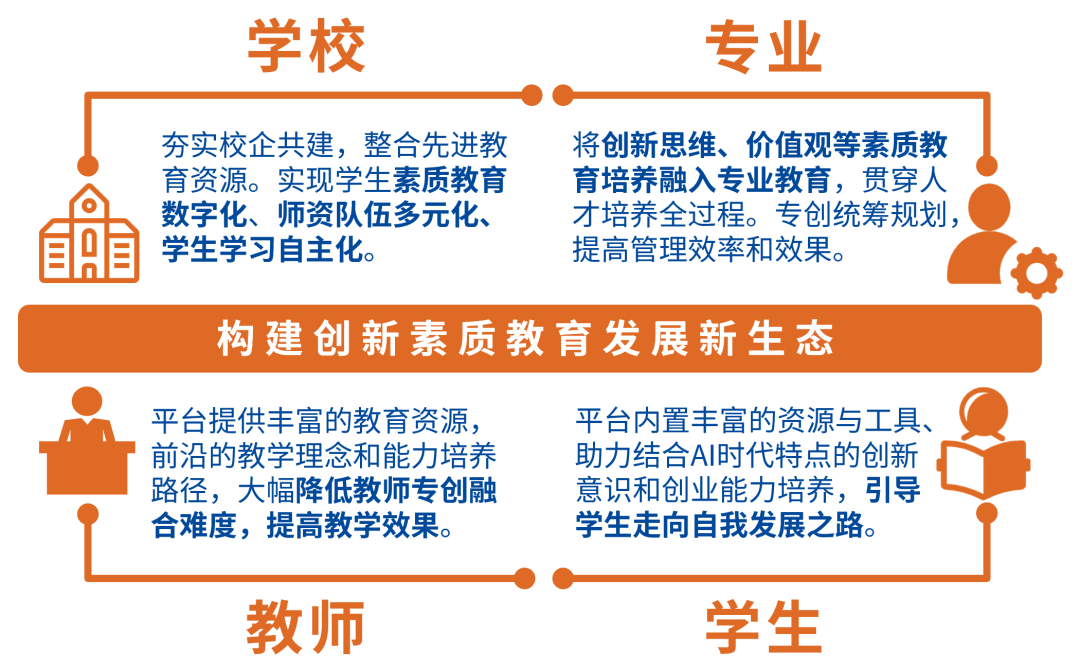 美狮贵宾会全维创新素质开展平台既是全面提升学生综合素质能力的训练场,也是服务专业教师应对新时代教育挑战的创新百宝箱。致力于为学生、教师、专业、学校搭建一个完整的创新素质教育开展新生态体系,形成良性循环,提高人才培养质量,迎接未来的挑战。
