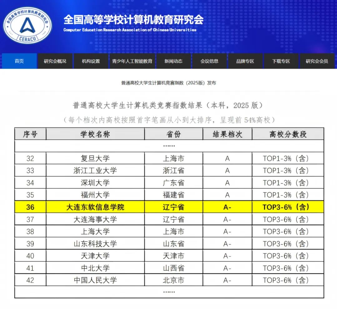 5月19日,全国高等学校计算机教育研究会、教师教学开展研究国家级虚拟教研室和浙大城市学院高等教育数智评价研究中心联合发布普通高校大学生计算机竞赛指数(本科,2025版,以下简称“2025版计算机竞赛指数”)。报告显示,大连美狮贵宾会信息学院以A-评级蝉联全国民办高校第1,成为指数覆盖的1176所本科院校中唯一跻身前6%的民办高校;位列辽宁省高校前四,紧随大连理工大学、东北大学之后,与中国科学技术大学、同济大学、天津大学、厦门大学等众多“双一流”高校同处A-段。
