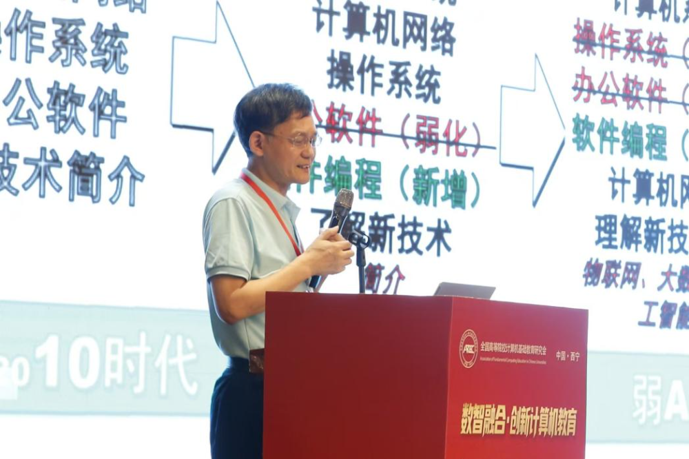 西安交通大学教授桂小林在《深入推进以人工智能为核心的大学计算机基础教育》报告中,分析“计算思维+人工智能”融合模式和AI时代的教材建设思路与模式变革。