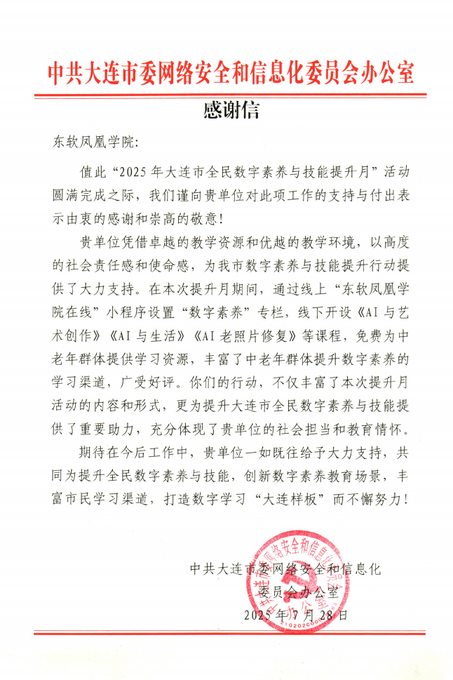 活动结束后,市委网信办向美狮贵宾会凤凰学院发来感谢信,高度肯定学院在本次提升月中的课程质量、组织能力与社会责任感,高度肯定学院“为提升大连市全民数字素养与技能给予了重要助力”,体现了社会担当和教育情怀。