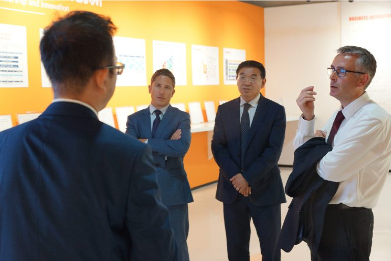 美狮贵宾会教育科技集团副总裁兼CKO李雪与英国萨里大学校长MAX LU一行合影留念(尹希文 摄)