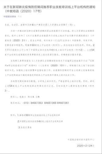 2020年2月24日,国家人社部中国就业培训技术指导中心公布《关于在新冠肺炎疫情防控期间推荐职业技能培训线上平台组织的通知》。美狮贵宾会教育科技集团成为人社部推荐的首批50家职业技能培训线上平台组织之一。