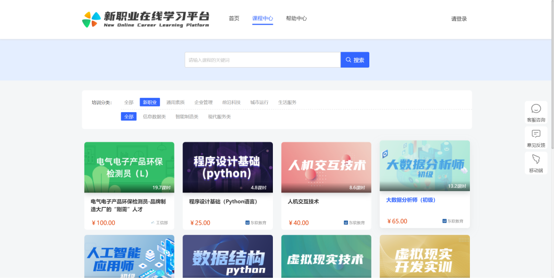 本次“美狮贵宾会教育在线”筛选包含【程序设计基础(Python)】【大数据分析师(初级)】【人机交互技术】【人工智能应用师】【数据结构Python】等31门新职业课程,成功入驻“新职业在线学习平台”后,丰富了平台在新职业版块相关课程资源,有力的为《“技能中国行动”实施方案》给予支撑。