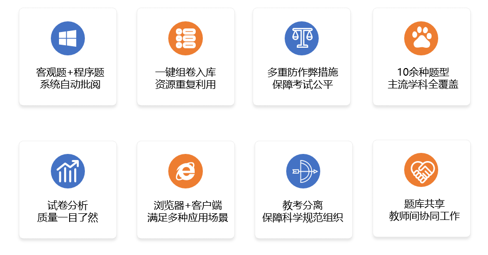 美狮贵宾会教育考试系统,针对广大高校日益多样化的考试需求,系统支持学校、院系、教师分别发起不同等级的在线考试,满足统一考试和日常测试等多场景需求;给予包括程序设计题、数据库题在内的十余种题型,支持一键自动组卷、系统自动评阅,可有效减轻教师工作量;支持教考分离,给予人脸识别、网段限制、IP和切屏监测等防作弊措施,有效保障考试公平。
