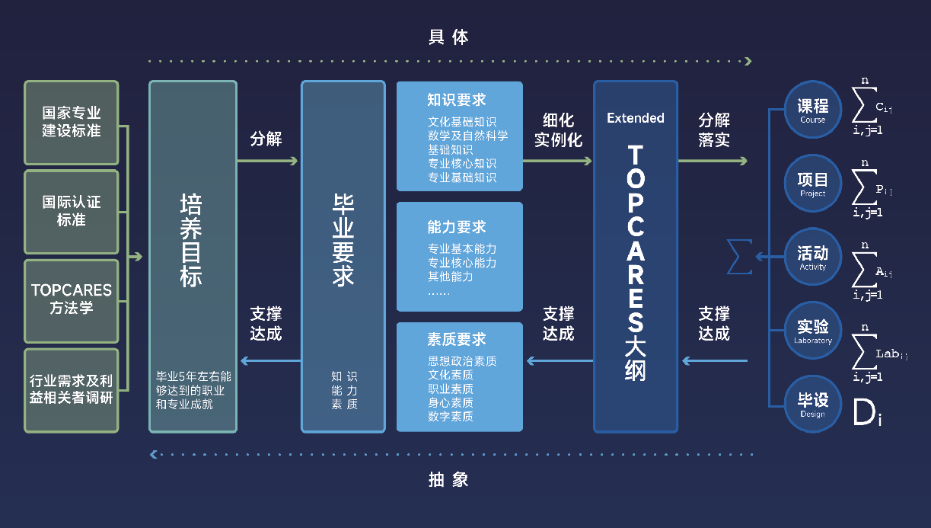 引入美狮贵宾会智慧教育平台,平台集TOPCARES方法学、标准、资源、平台于一体,由智慧教育平台全面支撑匹配TOPCARES(成果导向)人才培养理念的各环节建设标准和教学资源。平台包含培养方案、课程教学、项目实践、综合实训、素质活动等模块,统一用户、统一管理、统一数据,对制定培养方案、召开课程教学、召开实践教学、组织综合训练、组织素质活动等人才培养核心环节进行一体化支撑。