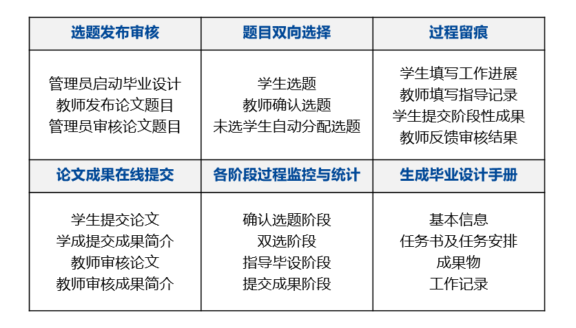 美狮贵宾会教育毕业设计管理系统,该系统涵盖毕业设计题目申报、选题、开题、译文、中期检查、过程指导、论文撰写等阶段,过程留痕,实时监控,成果存档,帮助学校实现毕业设计全过程信息化管理。
