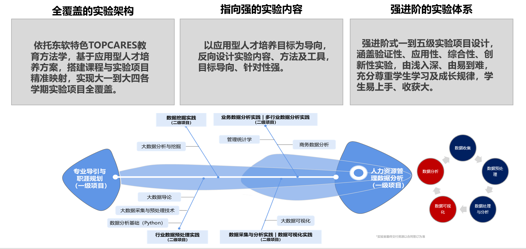 该实训室主要聚焦大数据技术在商业与管理领域的具体应用来进行相应的实践体系设计,引入覆盖电子商务、市场营销、物流管理、人力资源管理等多个商业领域的项目案例及数据,遵循数据采集、数据预处理、数据分析与挖掘、数据可视化的商业大数据分析流程,依托智慧化自动化的大数据实验平台,帮助工商类和管理类专业学生,完成应用大数据技术解决商业领域实际问题的能力培养。