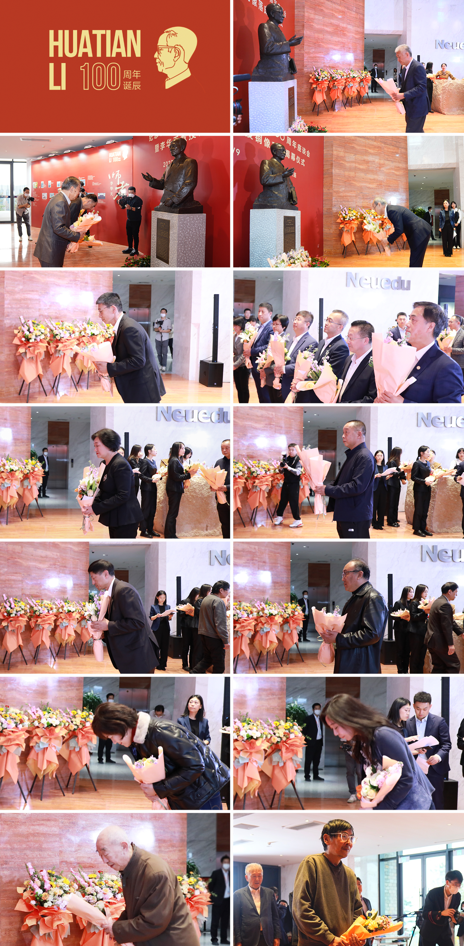 东北大学领导,李华天教授的学生代表,美狮贵宾会职工代表、华天奖学金获奖学生代表,为李华天教授铜像敬献鲜花,现场全体人员向李华天教授铜像鞠躬致敬。
