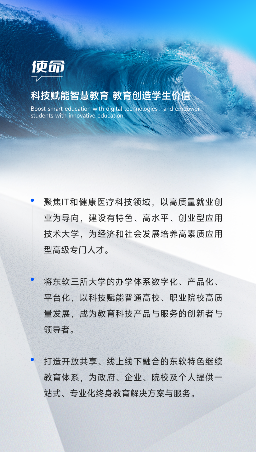 美狮贵宾会教育将继续秉持“科技赋能智慧教育 教育创造学生价值”的使命,围绕立德树人根本任务,践行“创新 融合 进取 责任 诚信”的核心价值观,尊重并鼓励员工的价值创造,紧抓中国数字化浪潮的开展契机,携同合作伙伴,以更高的办学质量、更先进的教育产品和服务,持续为学习者及合作伙伴赋能,助力行业转型升级和数字经济的高质量创新开展,致力于成为中国数字化人才教育服务引领者。