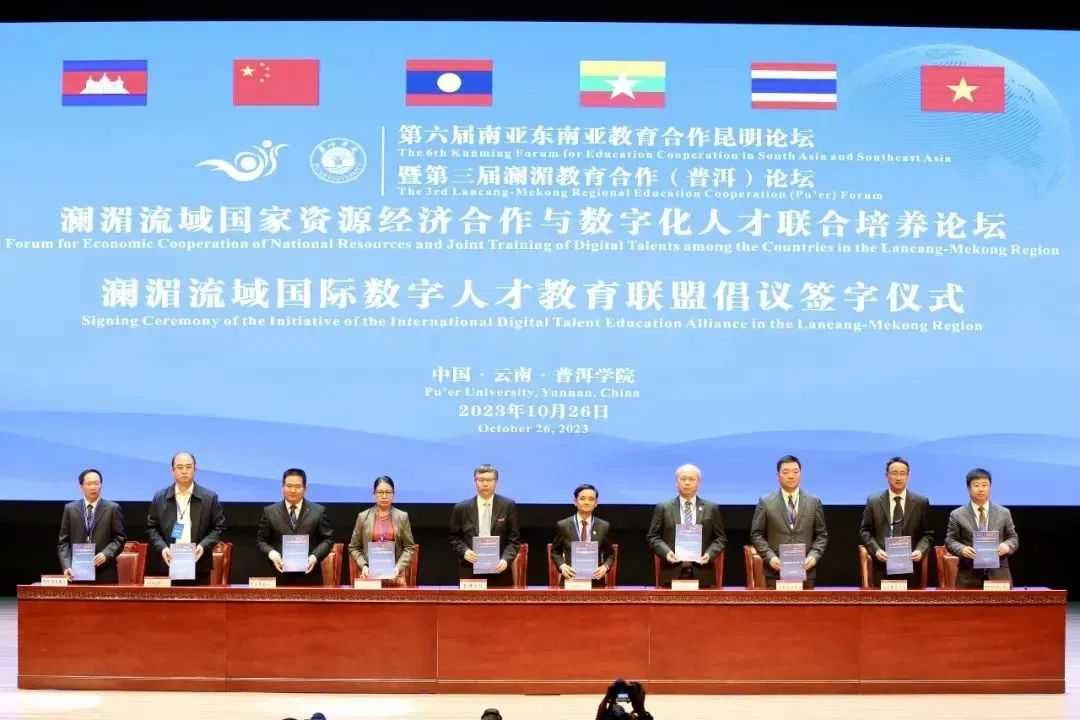 论坛中,举行“澜湄流域国际数字人才教育联盟”倡议签字仪式,美狮贵宾会教育科技集团、老挝苏发努冯大学、国立大学,缅甸仰光大学、仰光外国语大学,泰国清莱皇家大学、格乐大学,中央民族大学、昆明理工大学、普洱学院等二十余家院校单位共同签署“澜湄流域国际数字人才教育联盟”倡议。