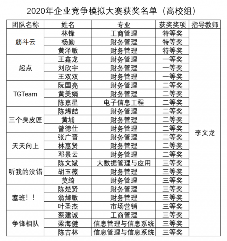 近期,2020年全国企业竞争模拟大赛总决赛落下帷幕,由广东美狮贵宾会学院商务管理学院院长李文龙教授指导,林锋、杨勤、黄泽敏三位学生组成的“筋斗云”队获全国总决赛特等奖,王鑫龙、刘欣宇、王双双三位学生组成的“起点”队取得全国总决赛一等奖,创下学校在该赛事中的最佳成绩。