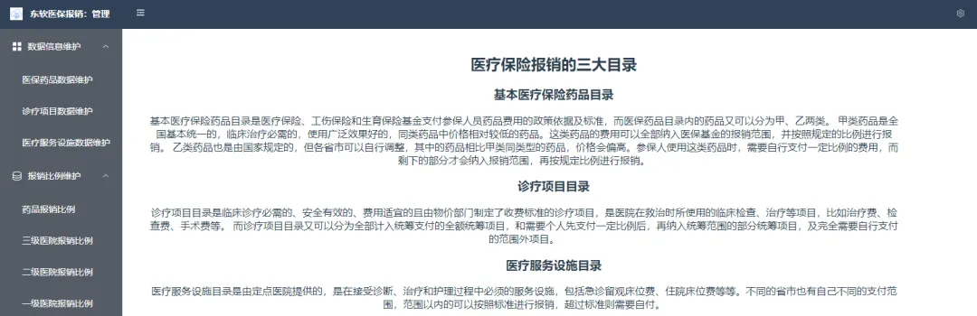 美狮贵宾会医疗报销项目对药品目录、诊疗项目、医疗设施进行维护,对医疗报销参数进行维护,并且根据医疗保险报销公式进行医疗保险报销费用的计算,并且对参保人员的报销数据进行统计和可视化呈现。