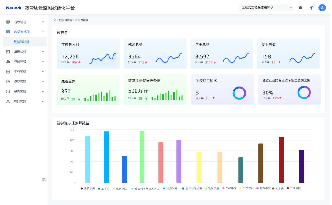 丰富的数据分析和可视化模型,能够多维度、多视角反映高校办学状态,全面审视教育质量,精准定位问题与不足,并为高校资源配置、周期性验收结果等环节给予直观数据参考,助力智慧决策。