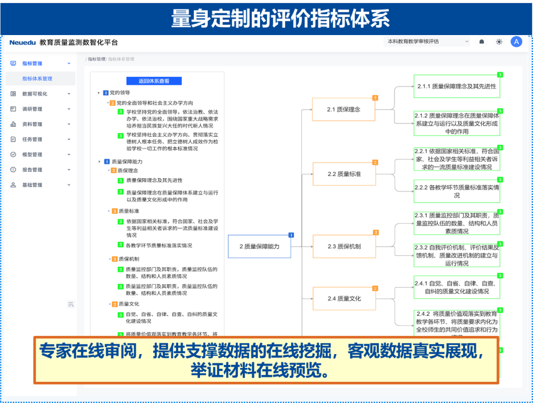 平台内置客观、科学反映高校各项重点工作成效的核心指标体系,在指标体系的驱动下有针对性的完成数据的收集工作,进行评价结果呈现以及分析改进的过程,最大化节约数据采集成本和缩短评估周期。