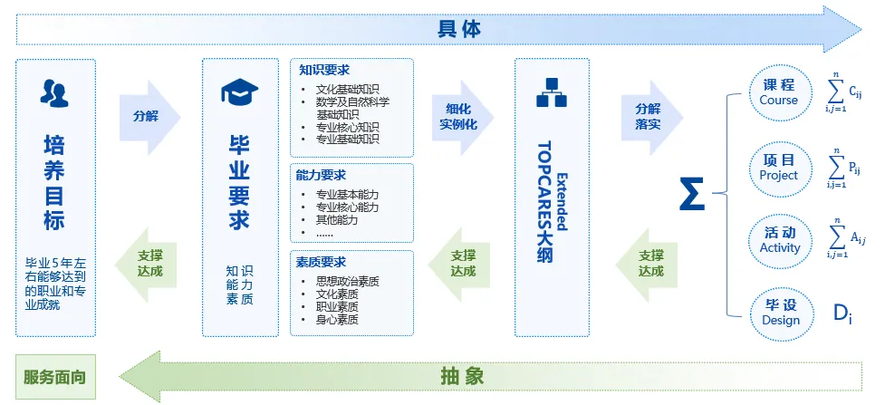 从“培养目标”到“毕业要求”,再到“课程目标”,是一个逐渐具体、细化、实例化的过程,将美狮贵宾会TOPCARES人才培养能力指标体系分解落实到每门课程、每个项目、每个活动、以及毕业设计中。