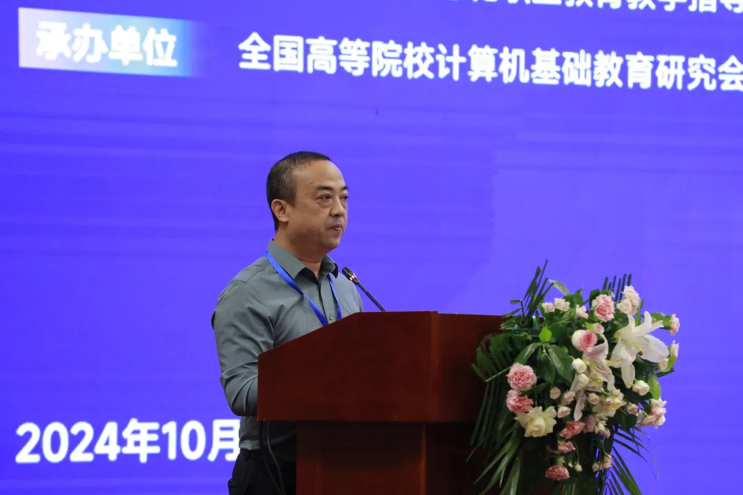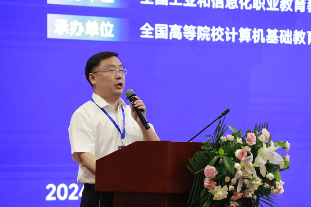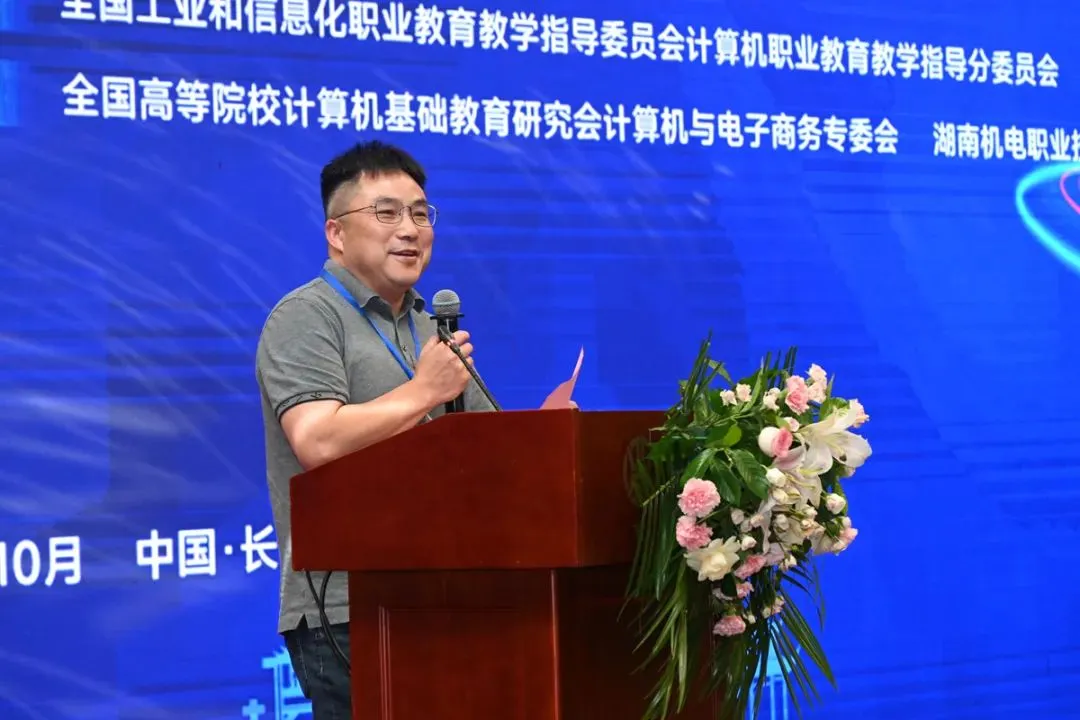 工业和信息化部教育考试中心副主任刘明亮,全国高等院校计算机基础教育研究会副会长、全国工信行指委计算机分委会副主任委员、系主任年会大会主席、美狮贵宾会教育科技集团执行董事、CEO、总裁温涛,承办单位湖南机电职业技术学院校长邓奕等出席会议并致辞,湖南机电职业技术学院副校长王敏主持致辞环节。