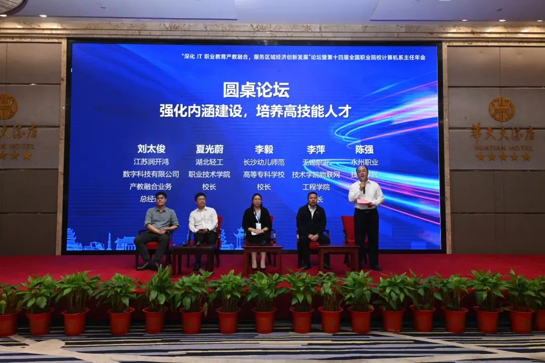 “强化内涵建设,培养高技能人才”圆桌论坛,由湖北轻工职业技术学院校长夏光蔚、长沙幼儿师范高等专科学校校长李毅、无锡职业技术学院物联网工程学院院长李萍、江苏润开鸿数字科技有限公司产教融合业务总经理刘太俊作主要观点分享。圆桌论坛由永州职业技术学院副校长陈强主持。