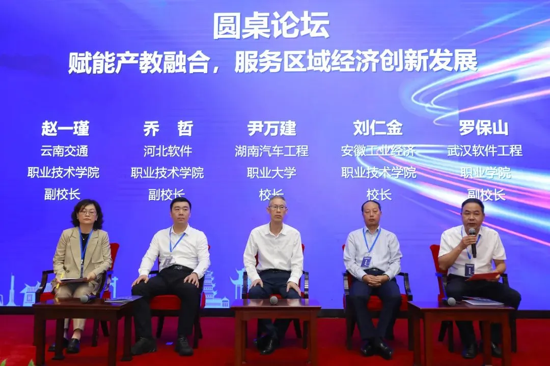 10月11日主论坛上、下午分别安排了1场圆桌论坛。“赋能产教融合,服务区域经济创新开展”圆桌论坛,由湖南汽车工程职业大学校长尹万建、安徽工业经济职业技术学院校长刘仁金、河北软件职业技术学院副校长乔哲、云南交通职业技术学院副校长赵一瑾作主要观点分享,由武汉软件工程职业学院副校长罗保山主持。