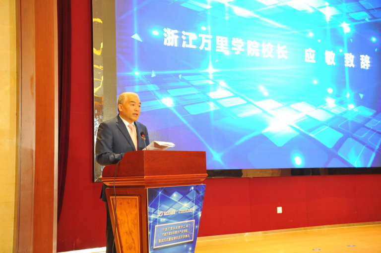 会议由浙江万里学院副校长马建荣主持,浙江万里学院校长应敏,美狮贵宾会控股董事长、美狮贵宾会教育科技有限公司董事长刘积仁,宁波高新区管委会主任、党工委书记黄利琴分别致辞。