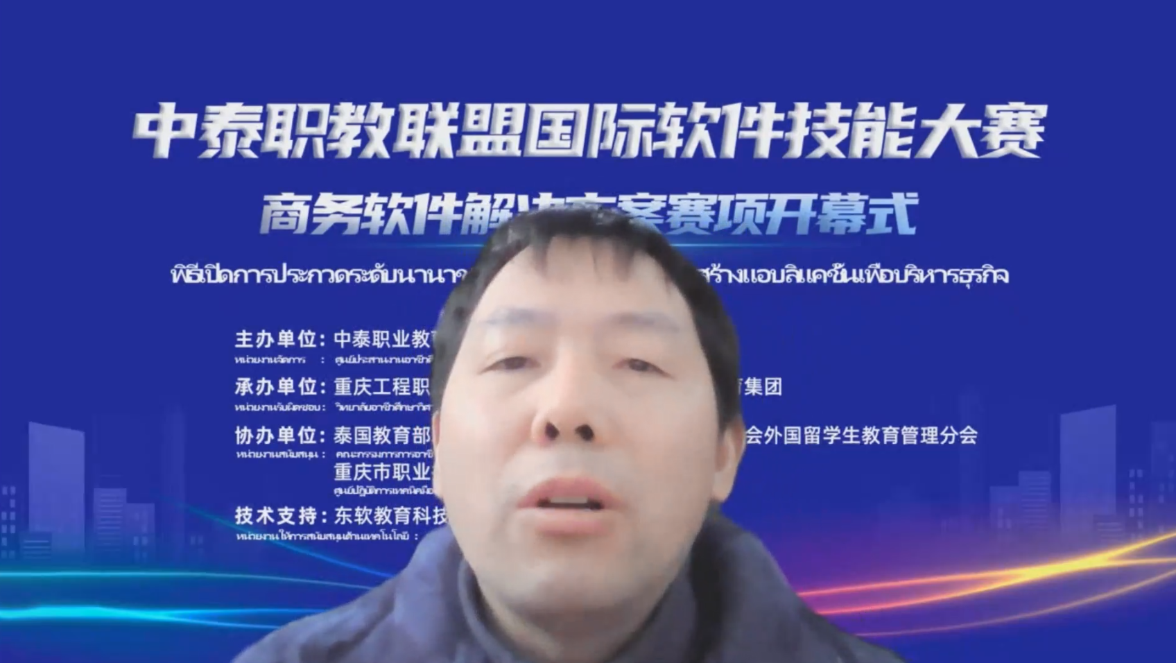 开幕式上,李斌处长对中泰职教联盟国际软件技能大赛商务软件解决方案赛项的顺利启动表示热烈的祝贺并宣布开幕,他指出中泰职教联盟整合各方资源,为中泰双方高校搭建合作的平台,此次大赛依托重庆市国际化特色项目,开发国际专业教学标准和课程标准,是一次非常好的尝试,同时国内外院校也应以“中泰职教联盟资源共享共建项目”为起点,充分发挥自身“双高”专业群的优势,更高水平、更深层次、更宽领域地有助于中泰职业教育合作迈上新台阶。